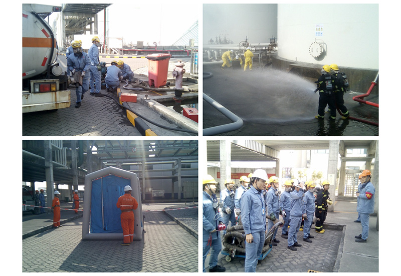 1月23日,盛源公司聯合立沙島應急基地在罐區(qū)舉行了T610罐金屬軟管破裂“盲演”(不預先通知時間、地點,不設臺詞劇本)?,F場作業(yè)人員發(fā)現T610罐金屬軟管發(fā)生破裂泄漏后迅速報告,總指揮迅速啟動公司生產事故二級響應,現場指揮組織各應急小組集合趕赴現場開展堵漏搶險工作。搶險救援組對泄漏點進行堵漏,但并未堵漏成功,隨后聯系立沙島應急基地請求外部支援。立沙島應急基地人員到達現場后,與公司各應急小組人員緊密配合,最終堵漏成功。