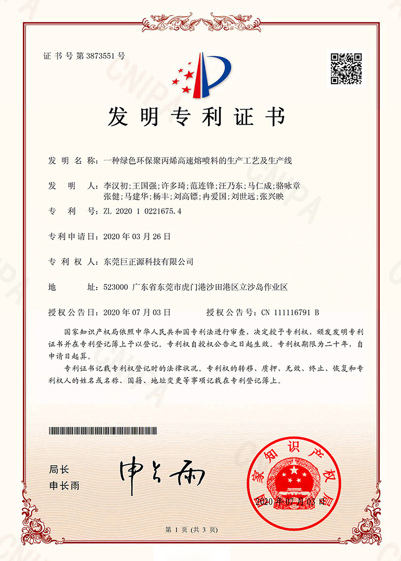 近日,由巨正源科技公司自主研發(fā)的“一種綠色環(huán)保聚丙烯高速熔噴料的生產(chǎn)工藝及生產(chǎn)線”獲得國家知識(shí)產(chǎn)權(quán)局授予發(fā)明專利證書(專利號(hào):ZL202010221675.4)。這也是巨正源科技公司獲得的首個(gè)發(fā)明專利。